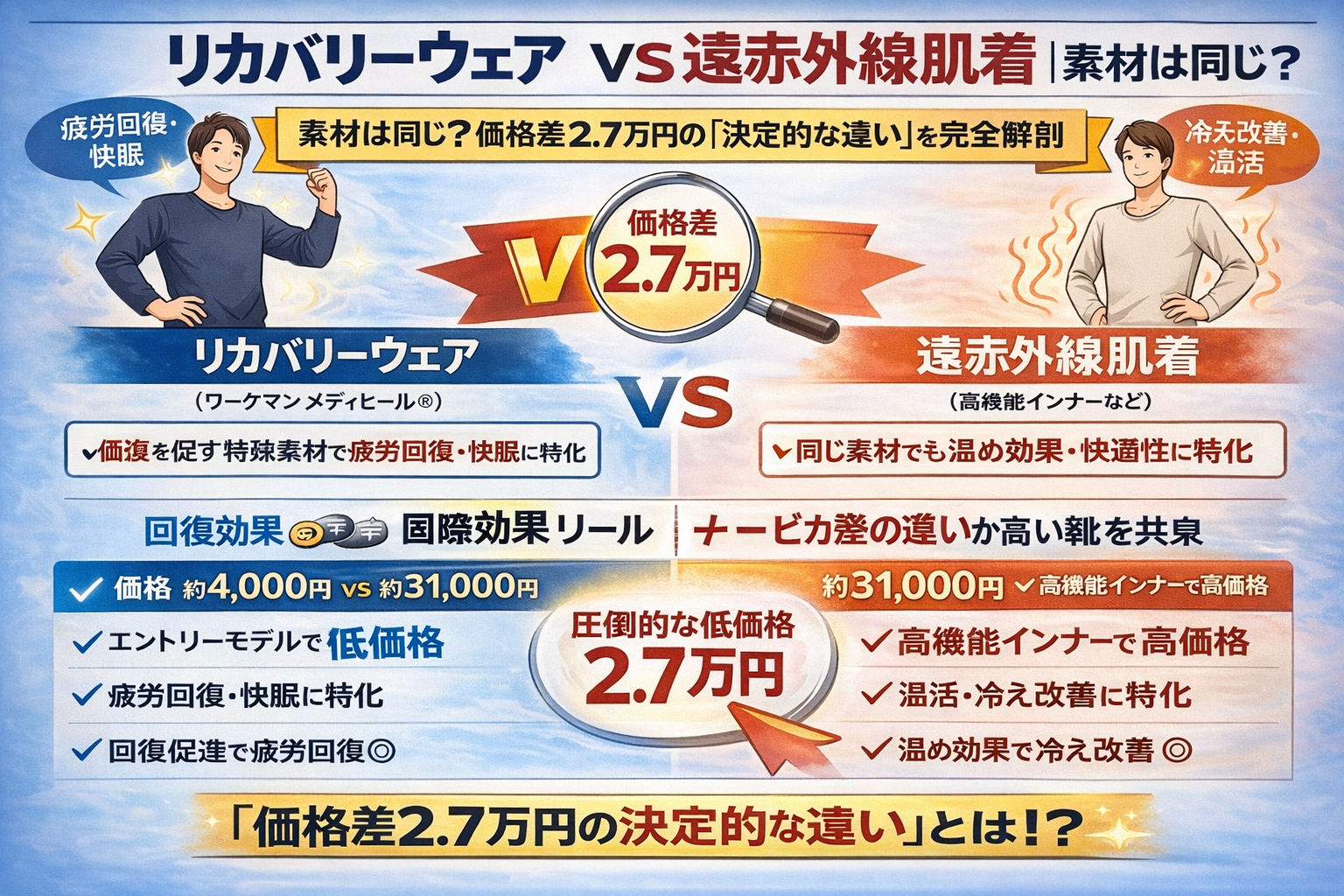 リカバリーウェアvs遠赤外線肌着|素材は同じ?価格差2.7万円の「決定的な違い」を完全解剖