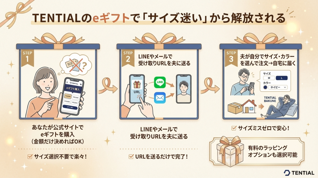 eギフトサービスとは、あなたがオンラインで「ギフト」として購入し、LINE・メール・SNSでURLを送るだけで完結するサービスです。受け取った夫が自分でサイズ・カラーを選んで注文するため、サイズミスが構造的に起きません。