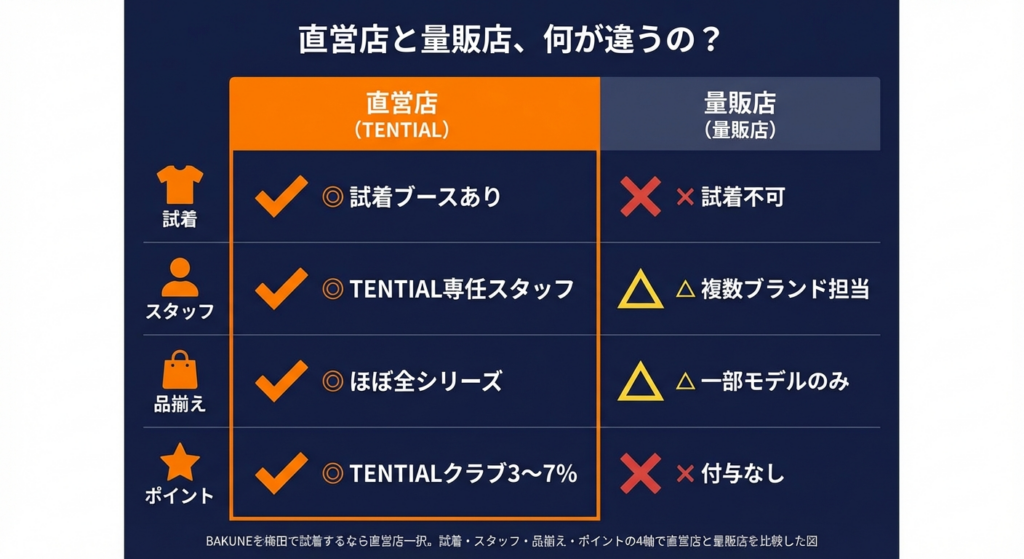 - 梅田で試着できる店舗はTENTIAL直営店2店舗のみ(ハンズ・ヨドバシでは試着不可)