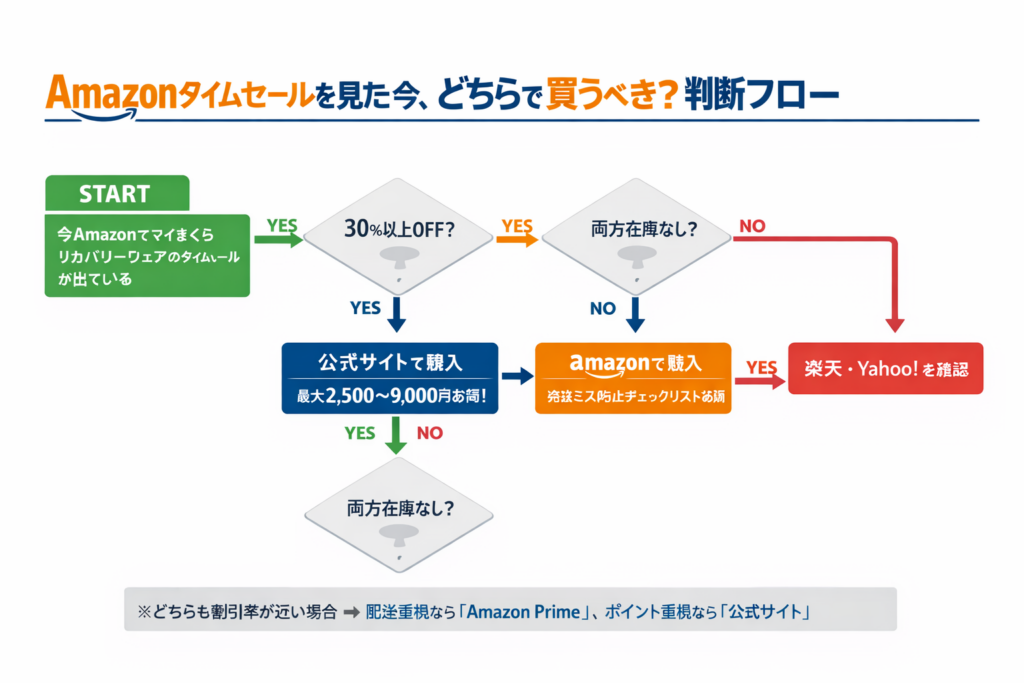 在庫切れリスクを考えると、「公式サイトを確認する1分」が最大のコスト対効果を生みます。公式サイトで30%以上OFFのセールが確認できればその場で公式サイトから購入、セールがなければAmazonに戻ってタイムセールを活用するという2段階の判断が最も合理的です。