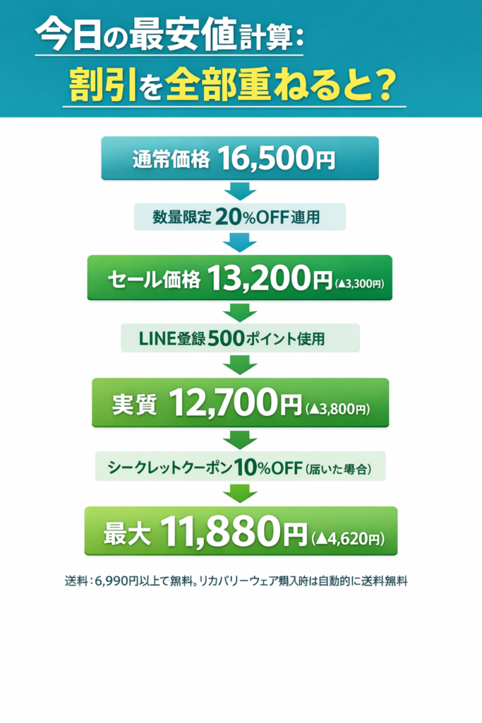 ※シークレットクーポンは常設ではありません。届いていない場合の実質最安値は12,700円です。送料はリカバリーウェア購入(13,200円〜)で自動的に無料条件(6,990円以上)を満たすため、追加コストはかかりません。