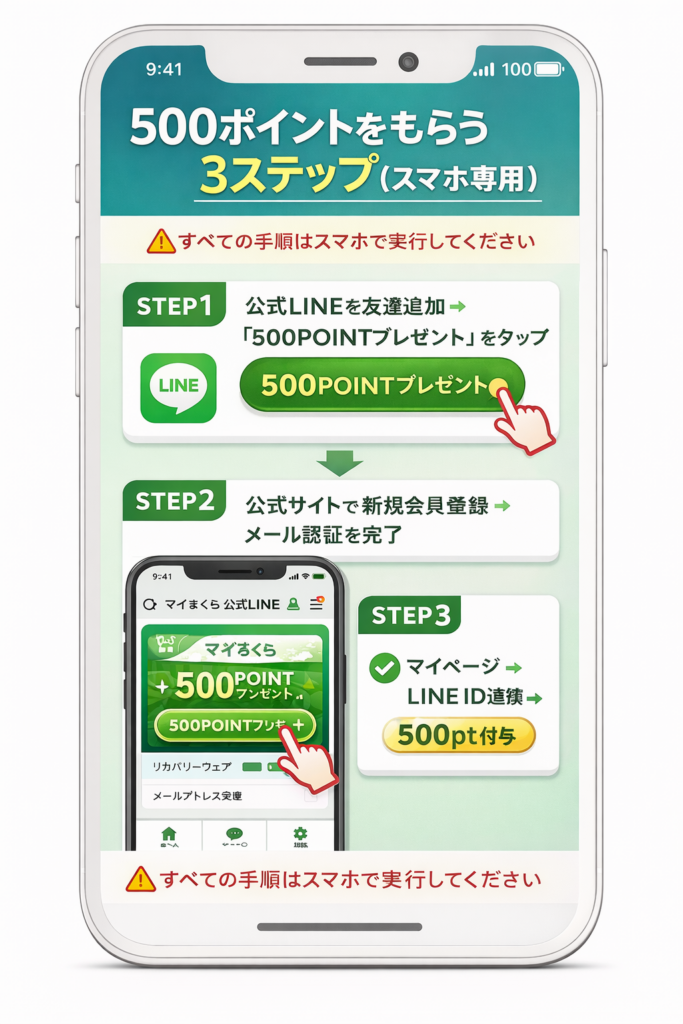 LINE登録500ポイントとLINE連携は、セットで理解する必要があります。500ポイントを受け取るには、LINEアカウントとマイまくら会員アカウントを「連携」させることが必須条件です。友達追加だけでは付与されませんので、以下の手順を最後まで完了させてください。