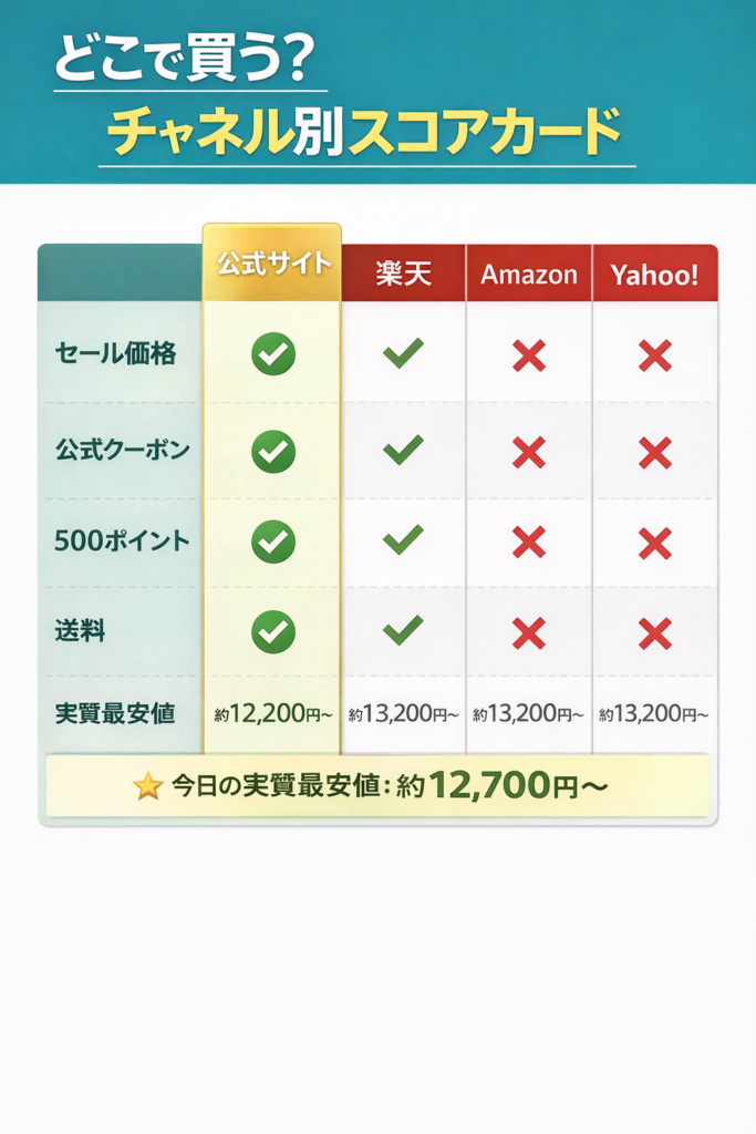 楽天・Amazon・Yahoo!を検討すべき例外ケース: 楽天スーパーSALEや楽天お買い物マラソン期間中に楽天ポイントが大量付与される場合、楽天ポイントを多く保有しているユーザーにとっては楽天市場が有利になるケースがあります。ただし、現在の公式20%OFFセール+500ポイントの組み合わせが同水準の割引を上回るかどうかは、その時点のポイント還元率との比較が必要です。