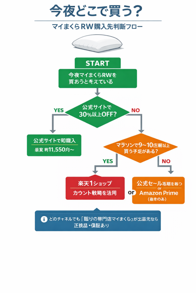 正直に打ち明けます。私もマラソン中に「P5倍!お得そう!」と反射的に楽天でマイまくらRWを定価で買ってしまいました。翌朝、公式サイトを開いたら30%OFFの11,550円。私が払った16,500円との差額は4,950円。このお金があれば子どもの給食費が払えた……そんな後悔をあなたにはさせたくないので、計算式ごと全部公開します。