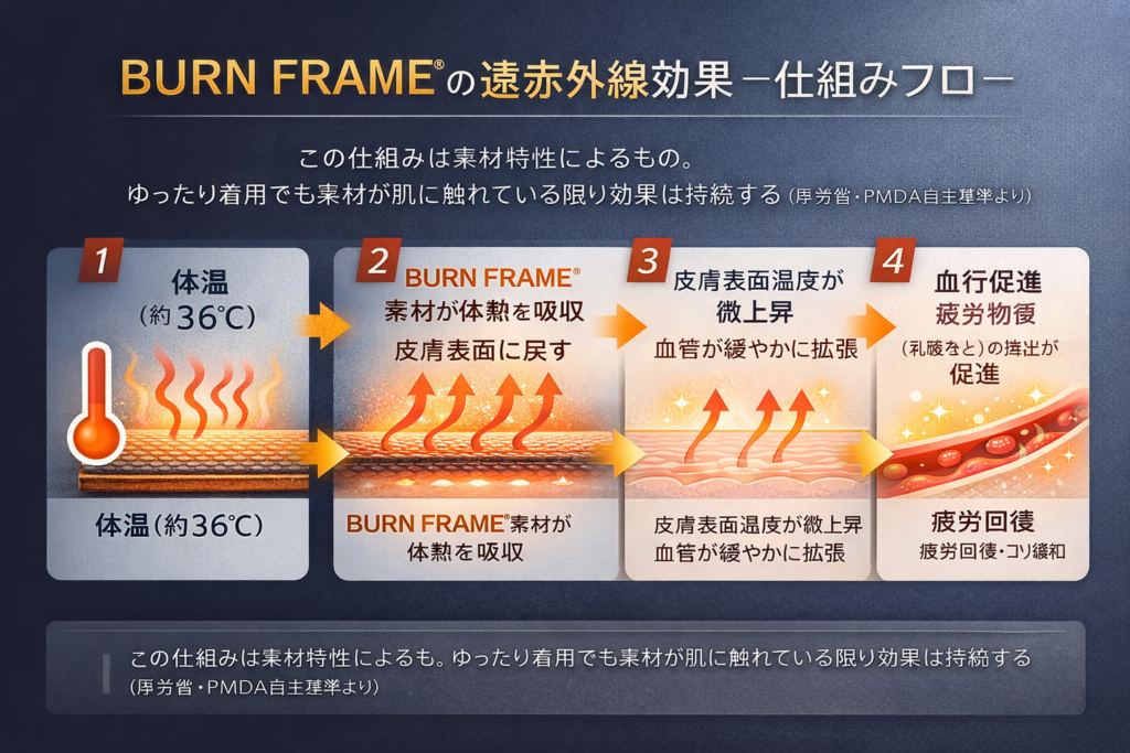 どちらのモデルもBURN FRAME®素材を採用しており、一般医療機器の届出を取得しています。遠赤外線による血行促進効果は素材特性に基づくため、モデル間での効果差は生じません。どちらを選ぶかは、季節感・着心地・サイズ感の好みで決めてください。
