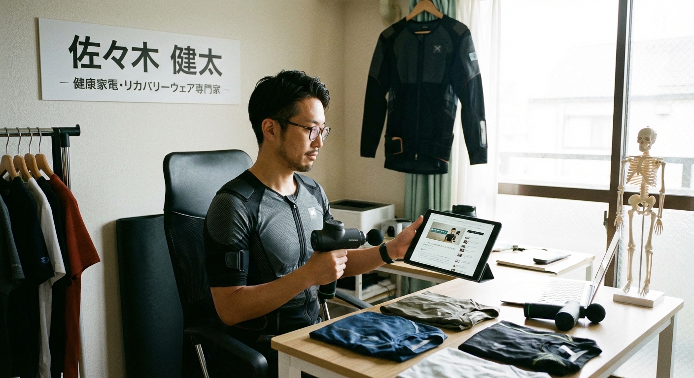 佐々木 健太(ささき けんた) 元理学療法士アシスタント(整形外科クリニック3年勤務)/健康家電・機能性ウェア専門アフィリエイター 延べ50製品以上のリカバリーウェアを実際に1〜2週間着用してレビュー。整形外科での勤務経験から、肩こり・腰痛患者の実態と「整骨院通いの本音」を熟知。