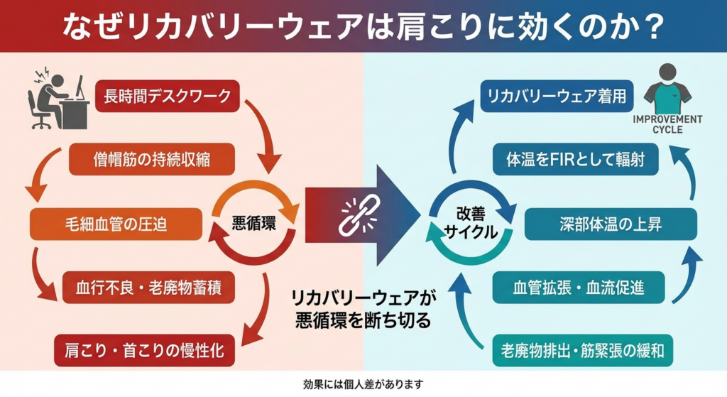 リカバリーウェアと肩こりの「血行不良→FIR輻射→コリ緩和」の因果連鎖は、以下のように整理できます。