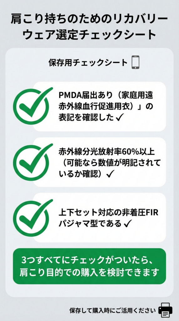 「寝ている間に肩こりを改善したい」という目的には、非着圧FIRパジャマ型の上下セットが最適解です。着圧タイプは運動後のクールダウンには有効ですが、就寝中の肩こり改善という文脈では非着圧パジャマ型に軍配が上がります。