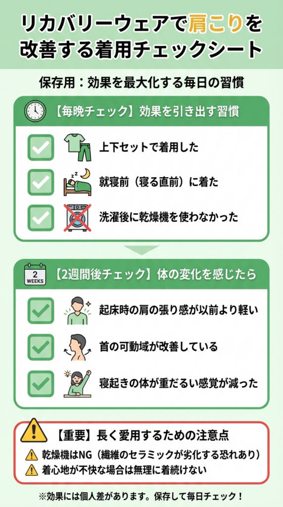 この違いを知っている人は、リカバリーウェアを賢く使えます。知らない人は、期待値が高すぎて「効かなかった」と感じやすくなります。正確な期待値設定こそが、リカバリーウェアで肩こりを改善するための第一歩です。