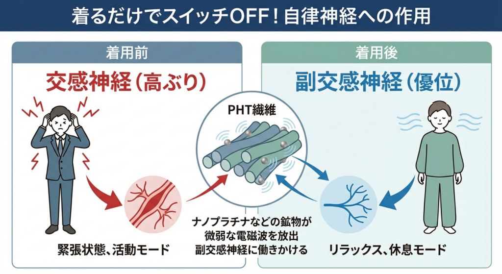 このPHT繊維にはナノプラチナなどの鉱物が練り込まれており、そこから出る微弱な電磁波が副交感神経(リラックス神経)に直接アプローチします。