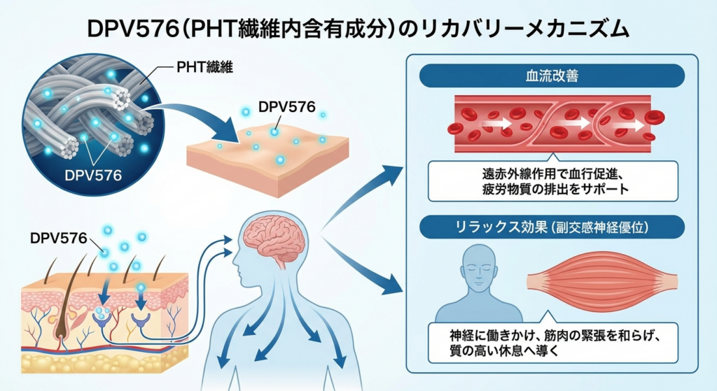 ベネクスのリカバリーウェアは、PHT繊維に練り込まれた独自素材「DPV576」が皮膚表面の感受センサーに働きかけることで、自律神経バランスにアプローチする設計とされています。とくに、過度に緊張状態へ傾きやすい交感神経の働きを抑制し、副交感神経優位の状態へ導くことを目的としています。